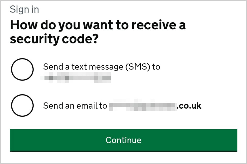 Please select whether you would like to receive the security code via SMS or email, and click the [Continue] button. After a moment (or up to a few minutes), you will receive a message with the code, which you should enter in the box, and then click the [Continue] button. See the image below.