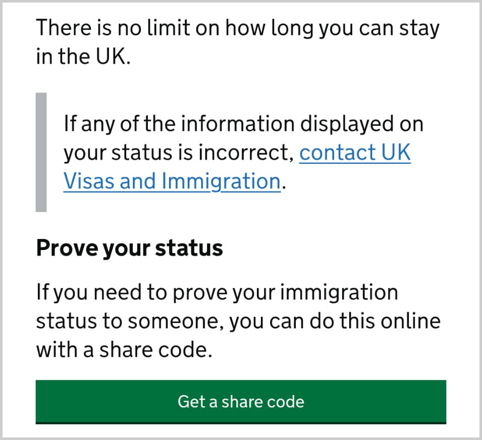 [5] After successfully entering the verification code, you will be taken to the page titled 'Your immigration status'. Below, there is a section called 'Prove your status', where you should click the [Get a share code] button. See the image below.
