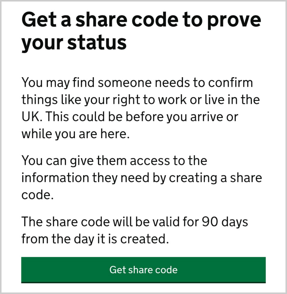 Next, to generate the 'share code' that confirms your right to reside in the United Kingdom, please click the [Get share code] button. See the image below.