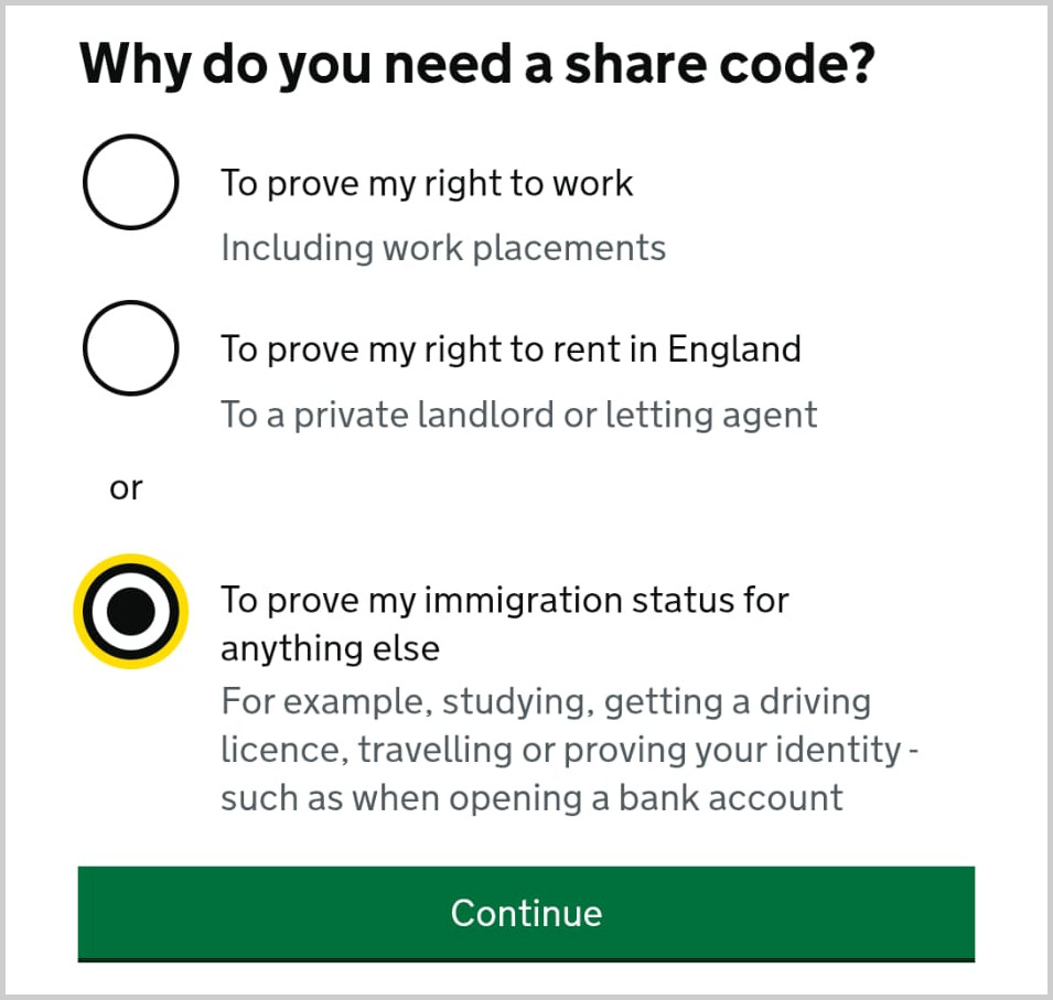 NOTE! Here, please select the option 'To prove my immigration status for anything else' (as the first two options confirm something different) and click the [Continue] button. See the image with the correct example below.