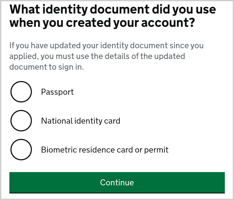 Please select from the list the exact same document that you used previously to register your application, such as a passport, identity card, or BRP card, and then click the [Continue] button. See the image below.