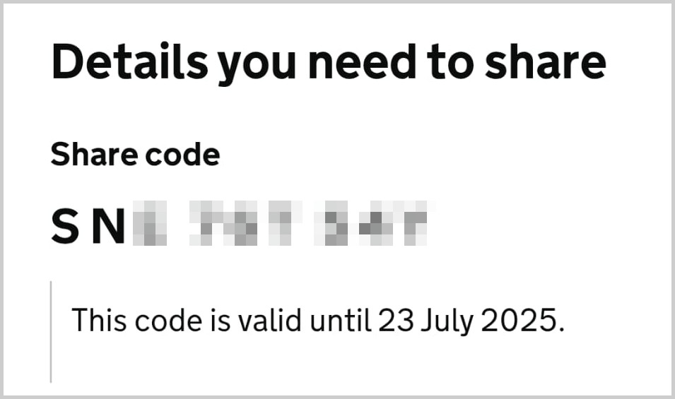 Finally, you will reach the last page titled 'Details you need to share'. There, you will find the generated Share code, which will be valid for 30 days from the moment it is generated. This code should be sent to the college administration and will confirm your right to, among other things, free education in the United Kingdom. See the image below.